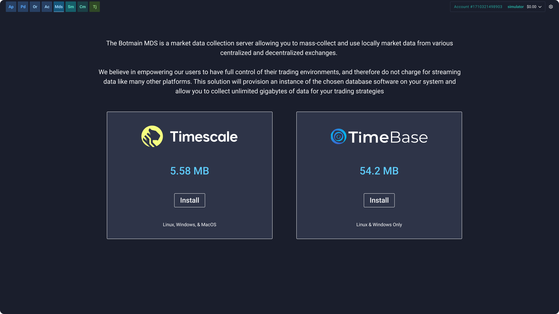 The Botmain MDS is a market data collection server allowing you to mass-collect, and use locally, market data from various centralized and decentralized exchanges.