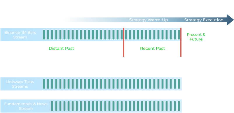 Datastreams combine historical and live streaming data into one continous stream that can be subscribed to by any numbers of your trading strategies. Strategies can "warm-up" on historical data until enough data is processed to begin making trading decisions, then seamlessly switch to streaming live data.