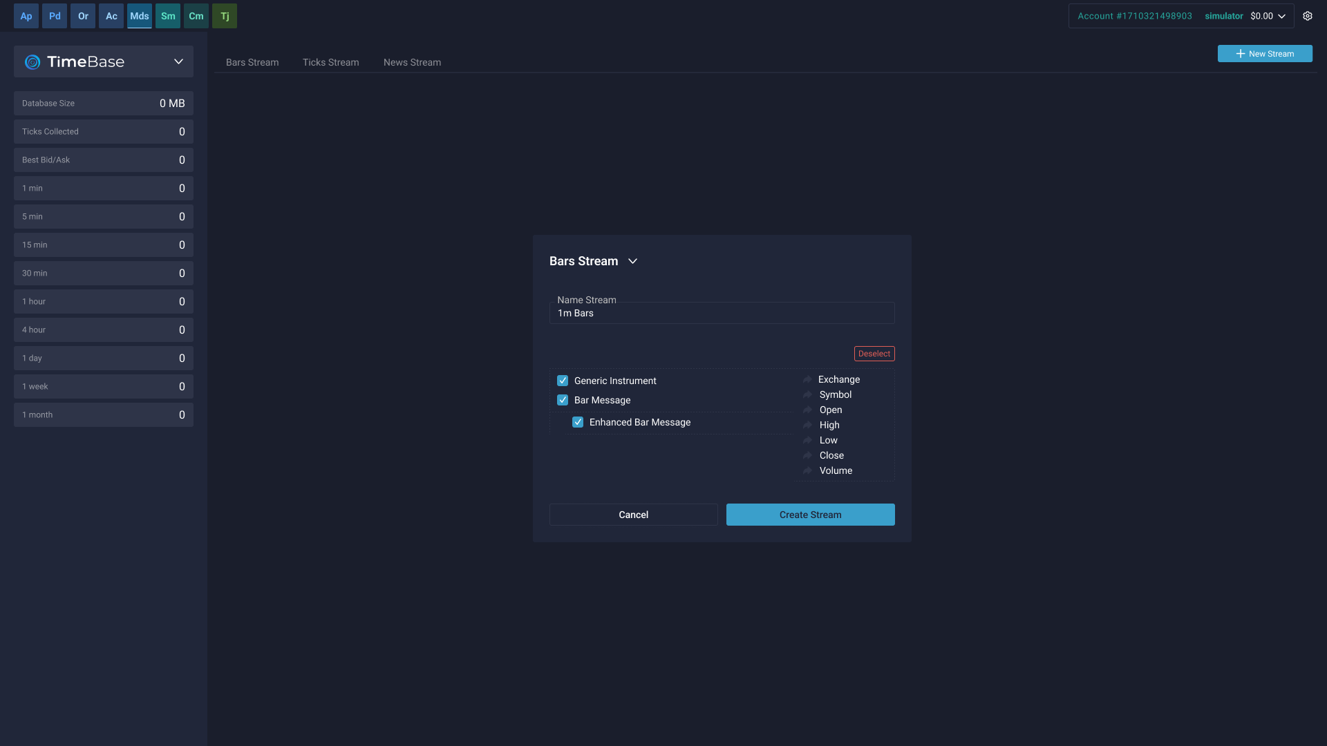- Selecting your newly created stream will display the overview of data in the stream, which should currently show as empty for all symbols. Using the checkboxes, find and select the instruments you want to collect data for.