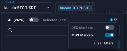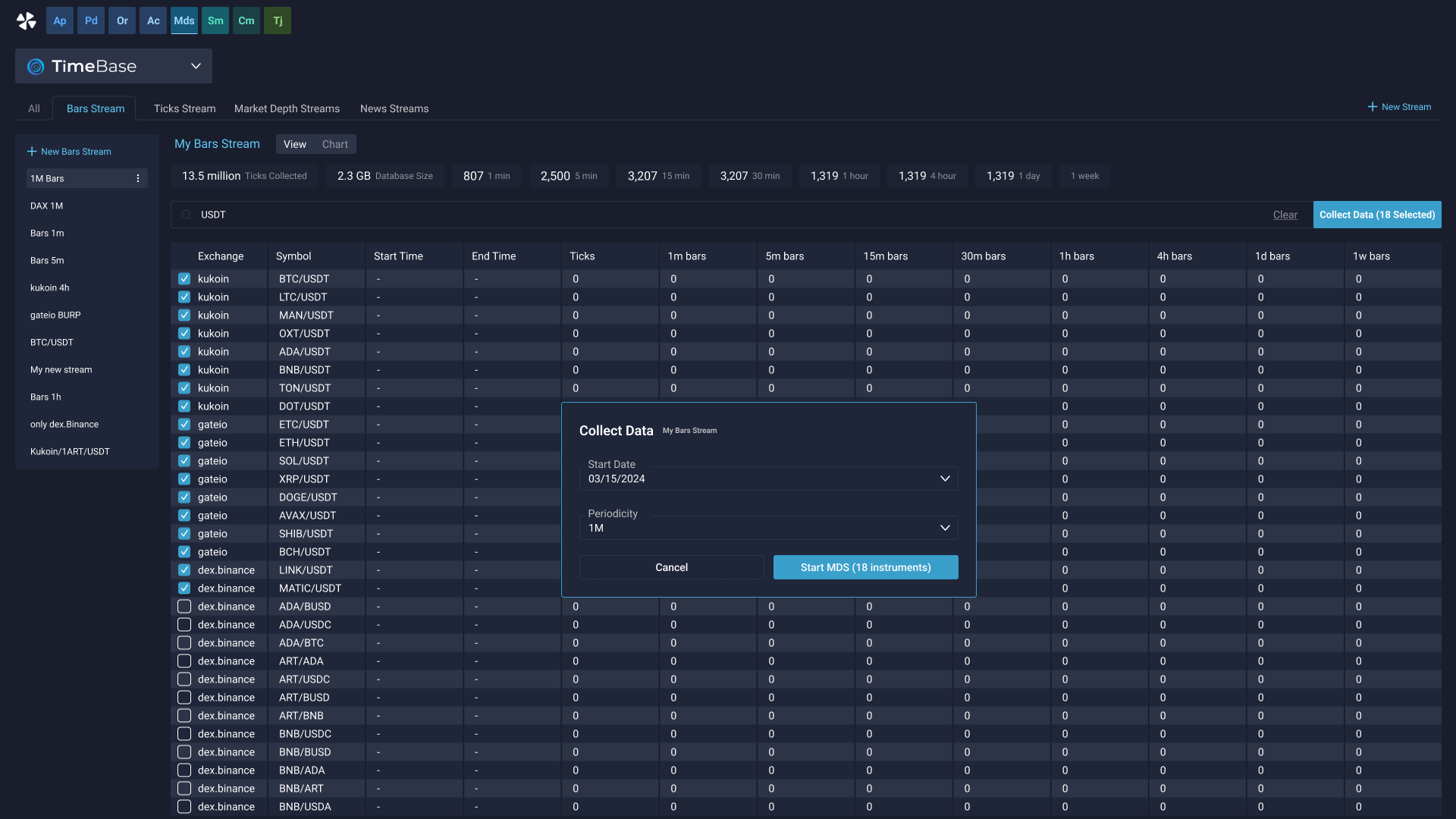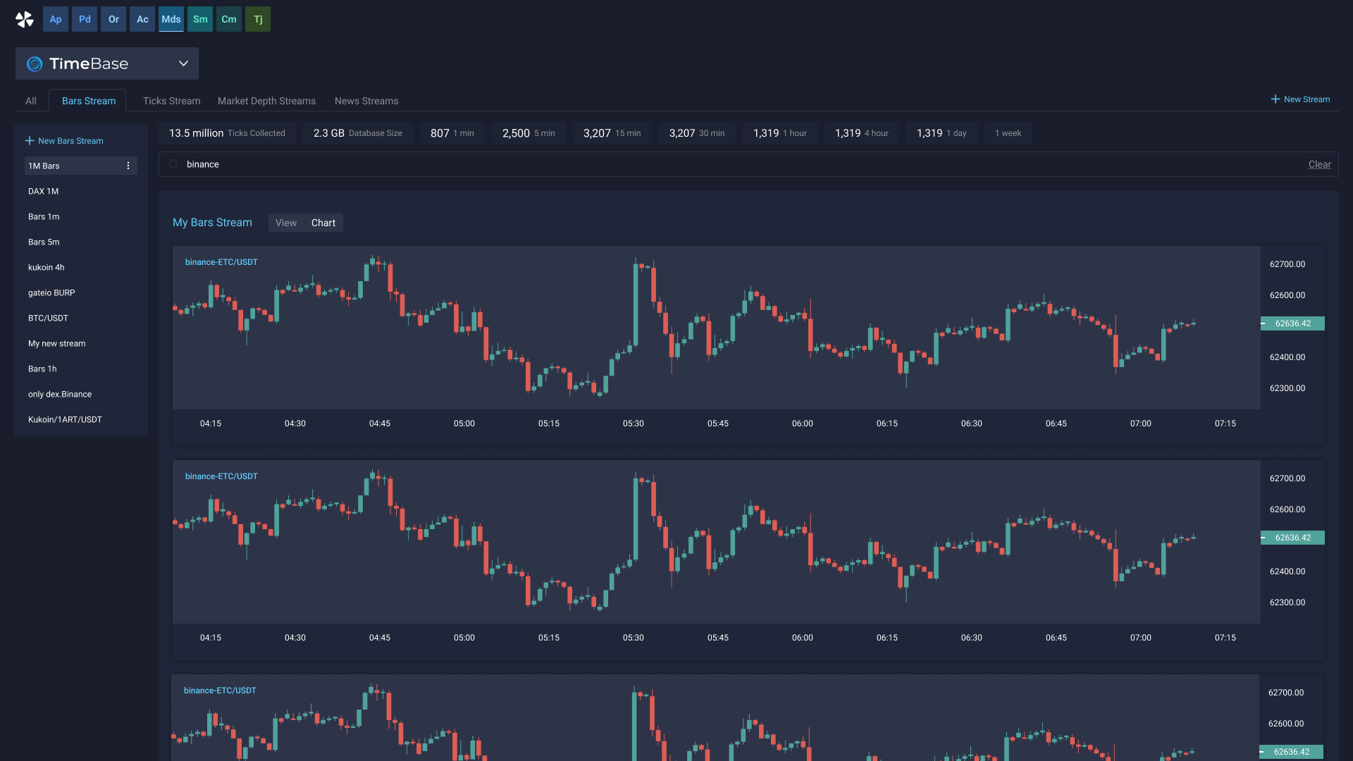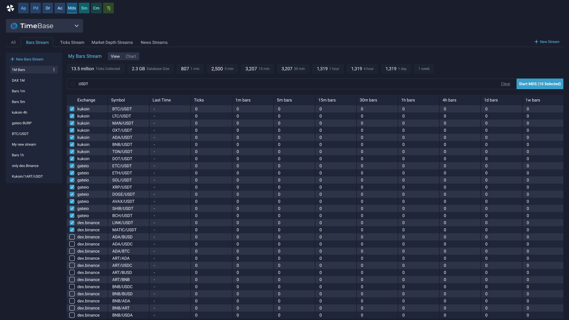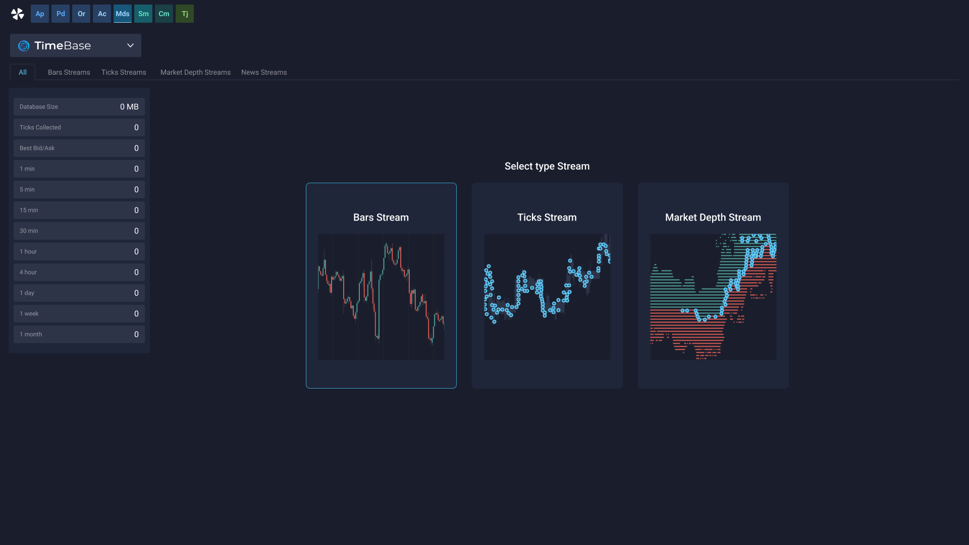 Datastreams in Botmain are configurable containers that can hold any type of data, from candles, ticks, & BBO to blockchain mempool data and even fundamental news data. Once price data is flowing into your streams, it is indexed on your computer for fast access and can be explored visually by filtering symbols to "MDS Markets" when selecting markets.