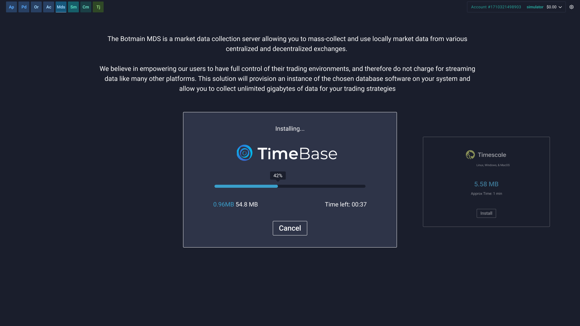 We believe in empowering our users to have full control of their trading environments, and therefore do not charge for streaming data like many other platforms. Cloud-based processing creates inefficiencies and drives up latency and costs. Instead, our solution will provision an instance of the chosen underlying database software on your local system and allow you to mass-collect your own data to power your testing and strategies. Thanks for advances in GPU-based processing, future features of Botmain will leverage massively-parallel, localized backtesting and optimization, without the spike in costs of would-be cloud-based solutions.