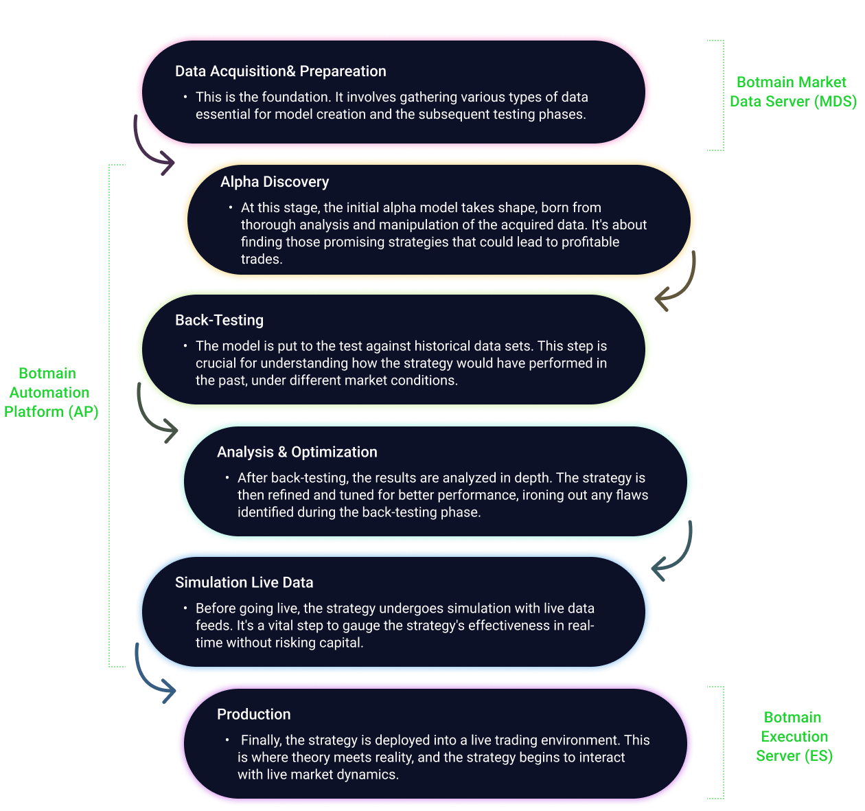 The Botmain Platform equips you with all the necessary tools to design, automate, and deploy sophisticated trading strategies. Build bots using our intuitive visual scripting tools or leverage the power and flexibility of Typescript/Javascript coding for ultimate control.