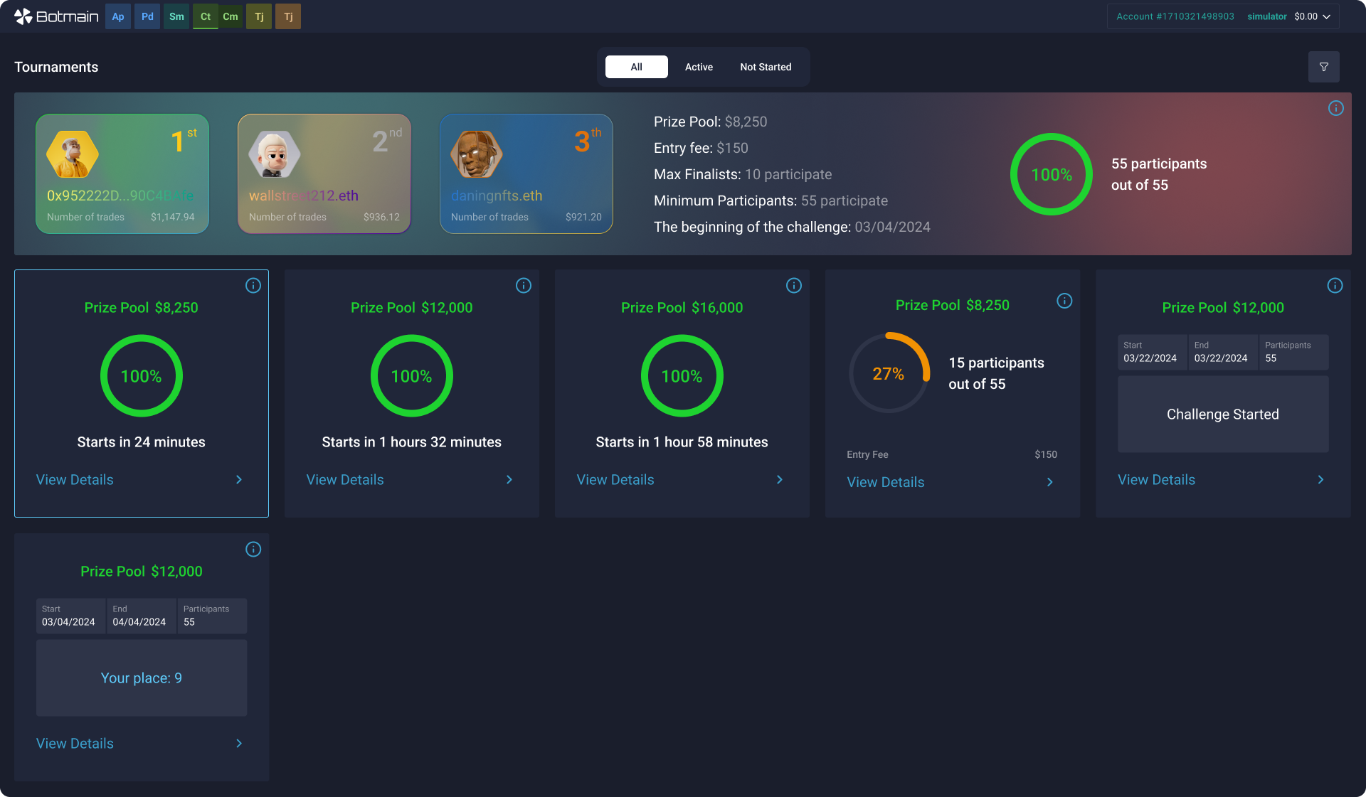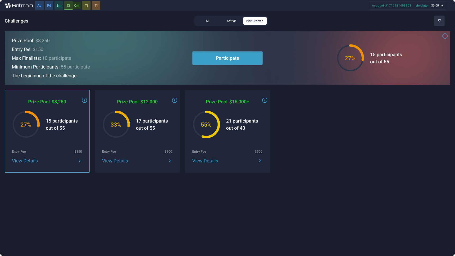 This is a tournament-style trading challenge using paper-trading accounts in a competitive setting. There are different entry fees of $150, $300, or $500 per challenge and all the money goes to the prize pool. Once the prize pool has the minimum number of participants with no new participants joininig in the last 2 hours, then the challenge begins and runs for 1 month. When it's over, the top 5 traders that pass the predefined risk criteria will be paid out a minimum of 10x the entry fee. The Botmain Treasury will receive the remainder of 5x the entry fee. If there are less than 5 traders that pass the criteria, their share gets split between the remaining traders that passed and the Treasury.