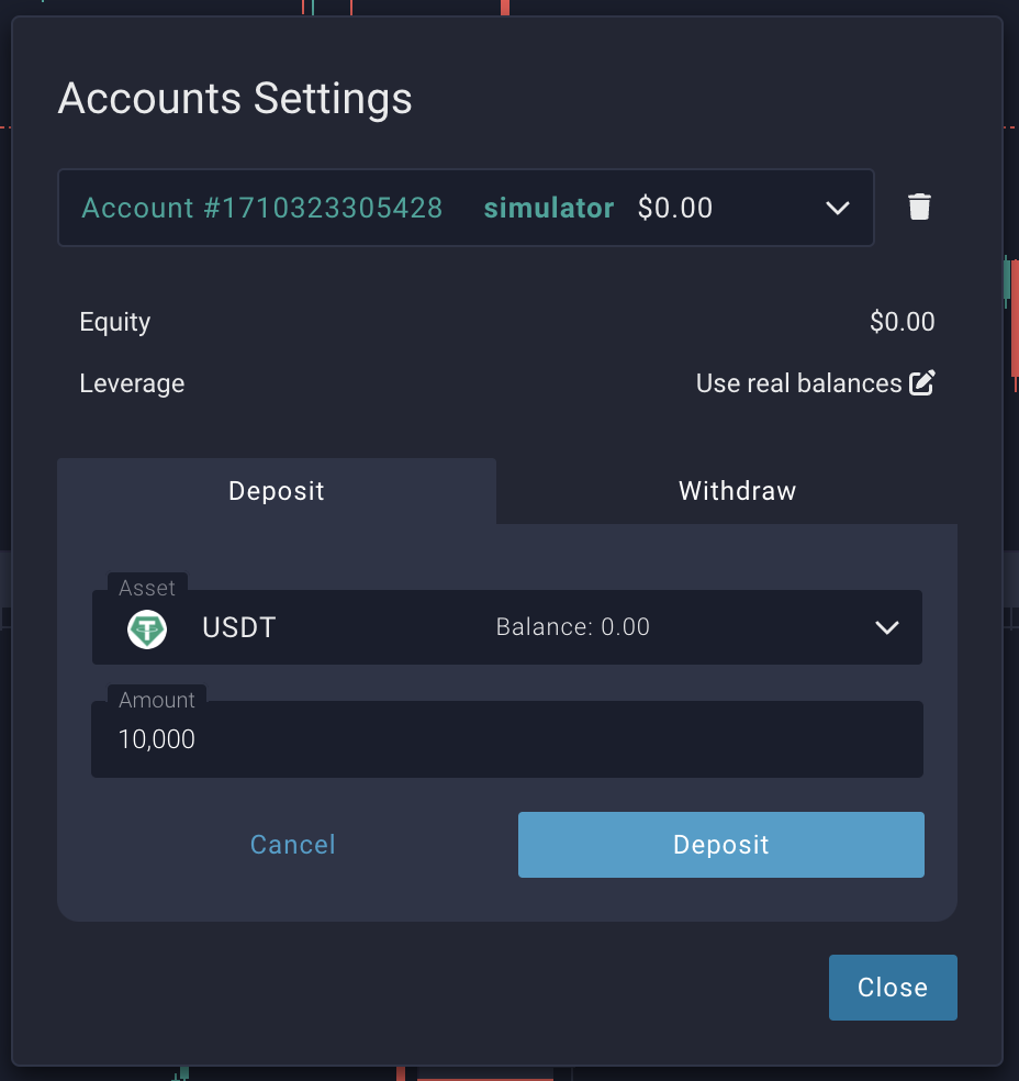 - Simulator Accounts: These are fake money accounts used exclusively for testing (backtesting, forward-testing, etc) and can be "funded" freely with any currency in a few clicks by going to the account settings: