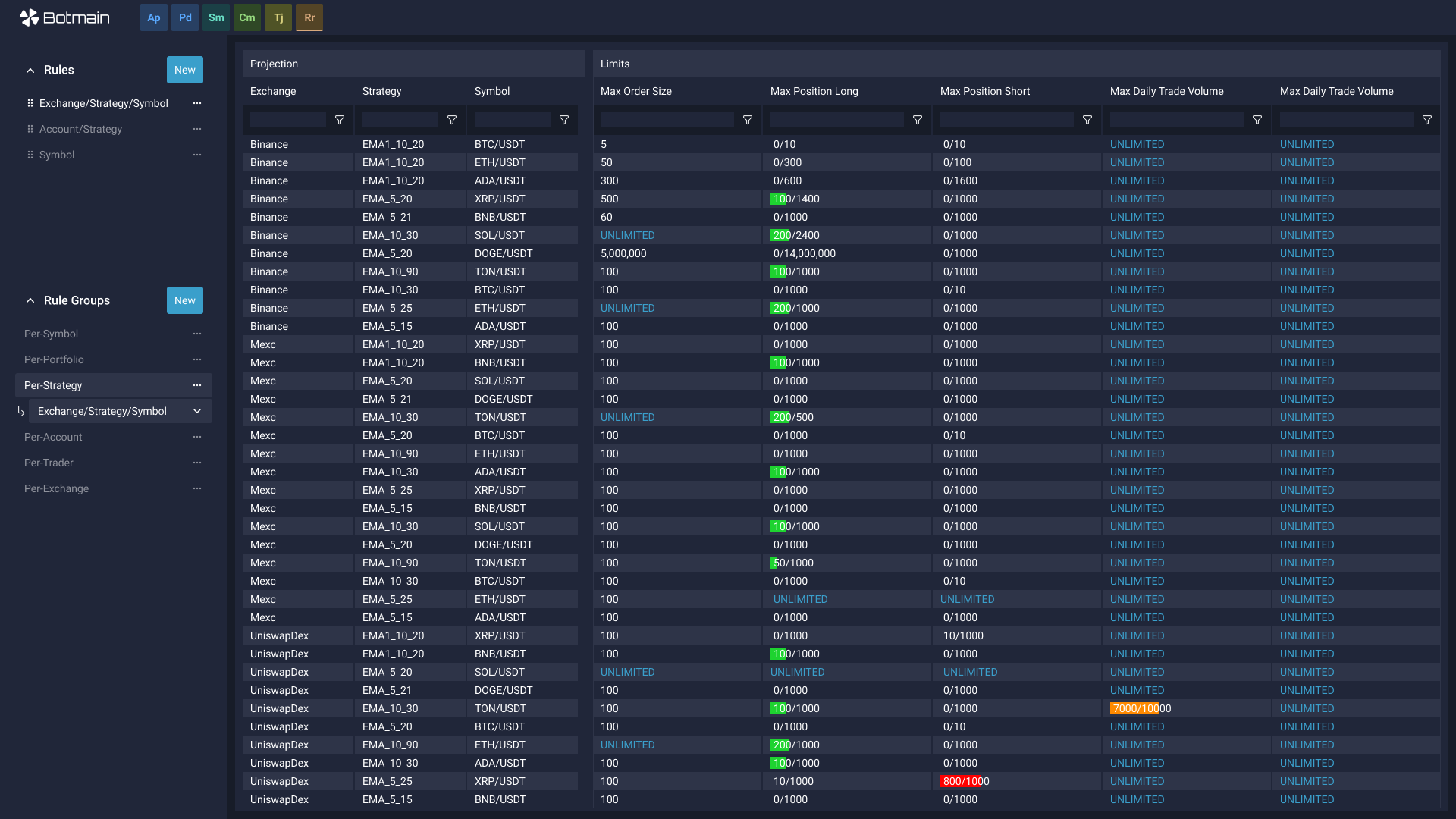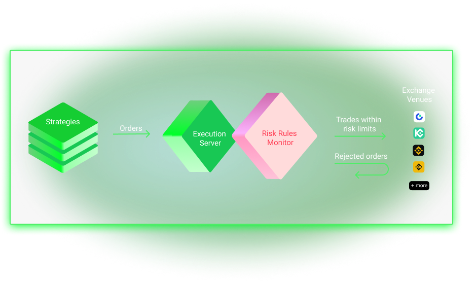 Risk controls are essential for managing risks associated with real-time trading. The Botmain Execution Server (ES) provides a robust risk control mechanism in the form of a declarative configuration that sits at the gateway, before orders are sent out to exchanges. The Risk Rules allows fund managers to limit market exposure and other key objectives, applied across multiple strategies running simultaneously that may not be aware of each other. Risk rules never place trades and can only reject trades that breach predefined thresholds.